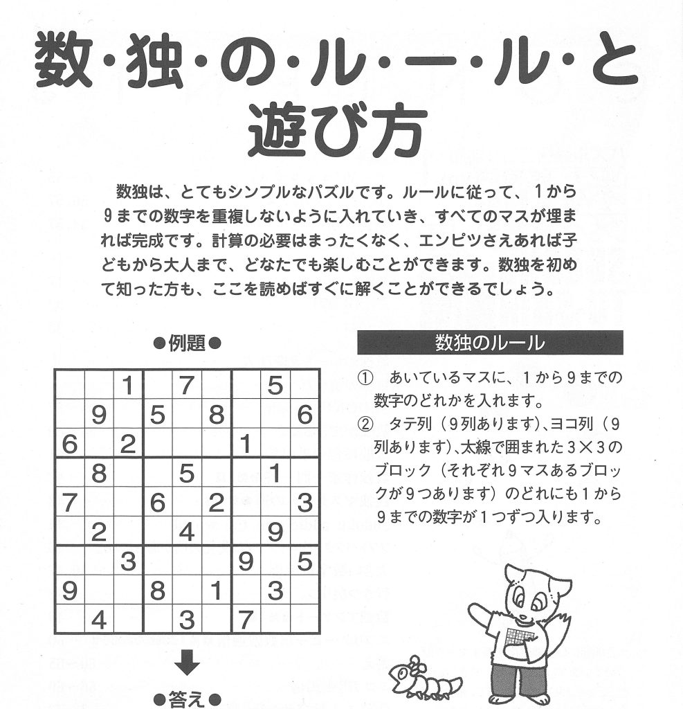 目次(P.3)をめくるとまず出てくるのは、数独のルールと遊び方(P.4)と数独の解き方(P.5)。